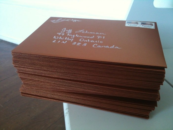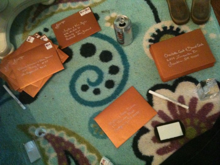 Invitations are addressed. The machine didn’t work, couldn’t print on dark paper with dark ink, so I asked someone to write white on them for me. Then I stamped a bird in one corner with white. They looked great and went out Thursday. A few people already have them and have RSVP’d. 🙂