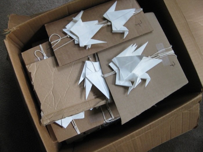 The cranes are done being strung, thanks to John. He not only did all the remaining ones, but he did them all in less than half the time it took me. He strung about 600 of them in less than 4 days. That box is a total of 750 cranes. I have 250 set aside for cupcakes and baskets, and I have to still make the men’s bouts.