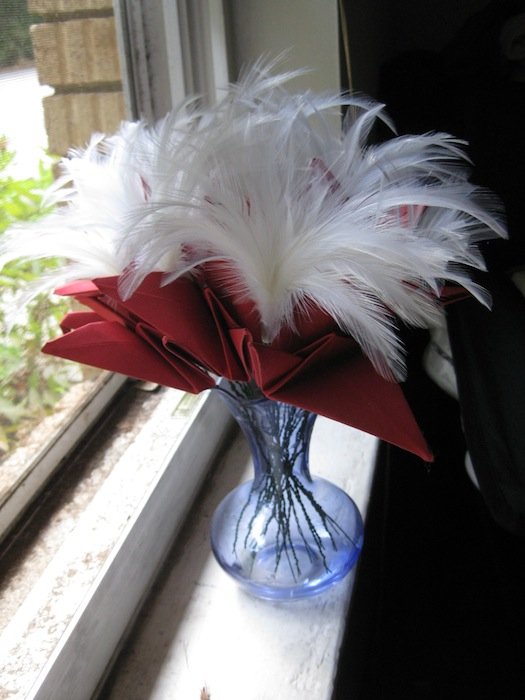 I have most of my bouquet ready to go. I have 12 red cranes and 12 ivory feather picks. The day of, my sister is going to run around with some garden clippers and build the rest of it for me. I know it’ll look amazing.
